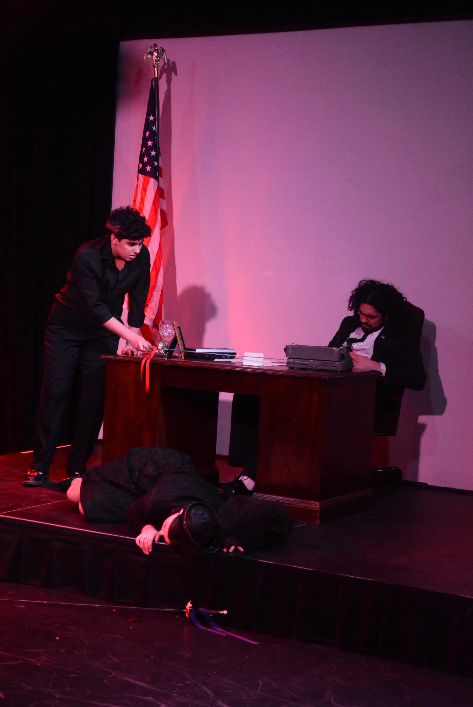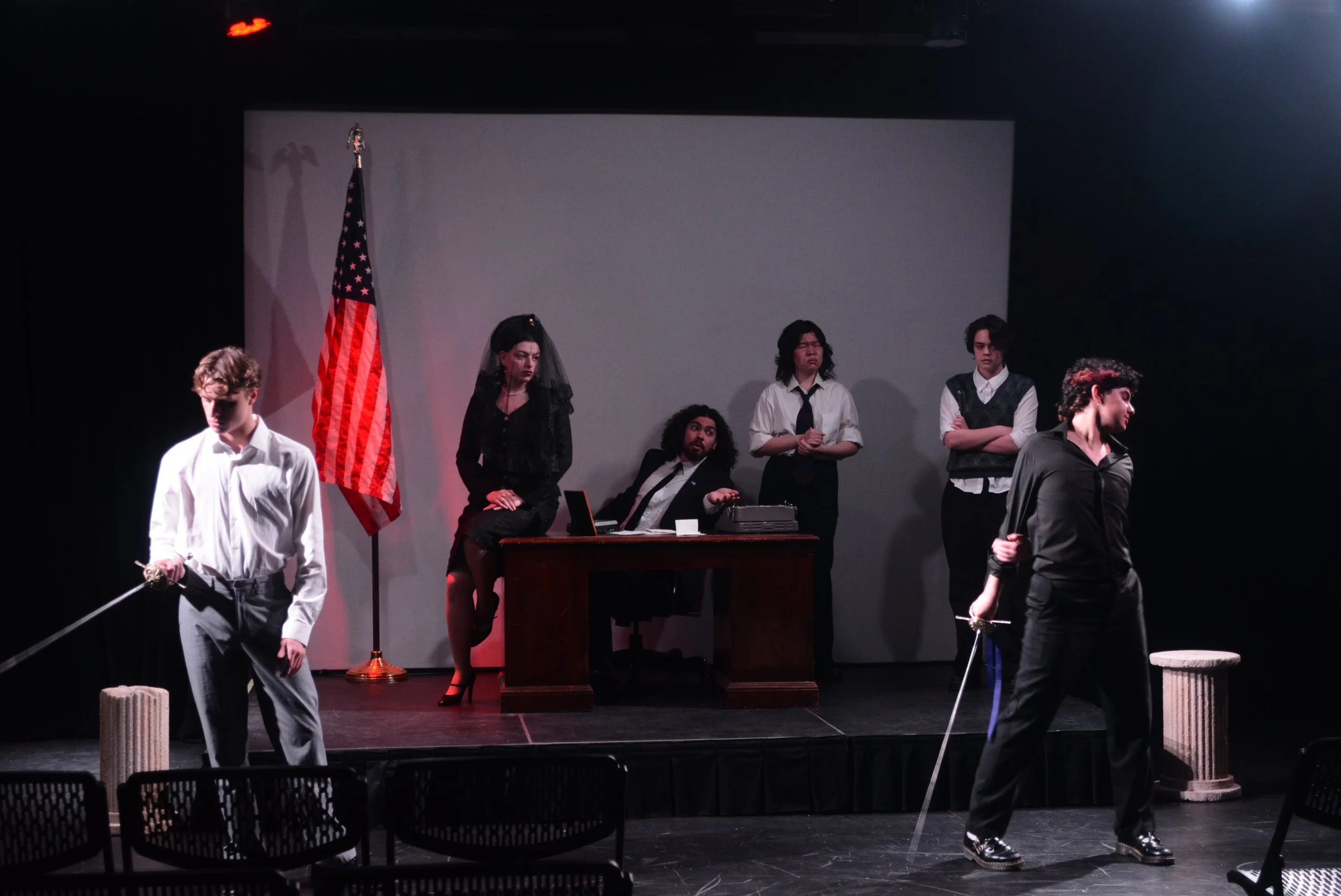 I designed and directed this production of Hamlet. For this production Hamlet was played by a trans man and we explored themes about how masculinity interacts with politics in the United States and how we can see that in some of the political dynasties of our day. The space needed to be very versatile allowing for quick transitions between scenes, while having a sort of looming presence throughout the show.