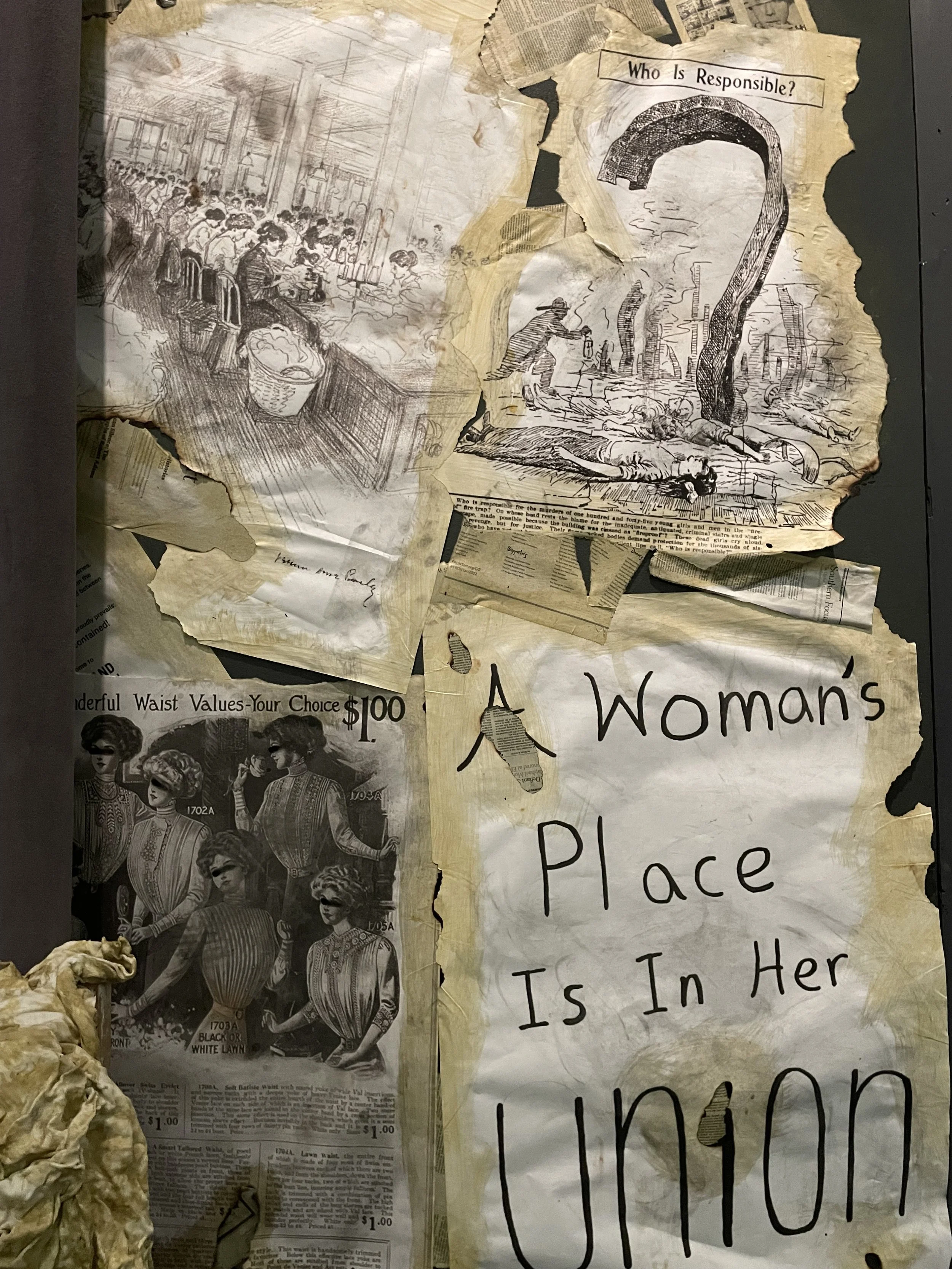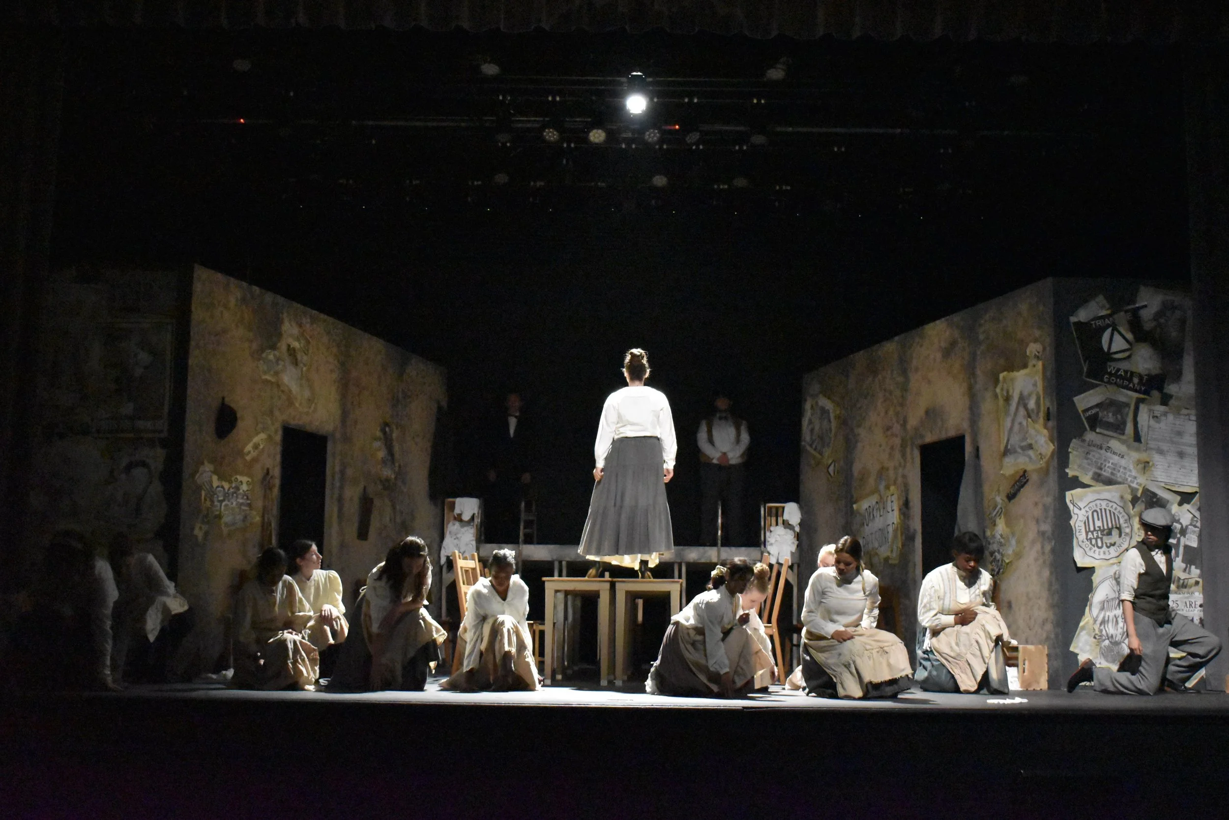 Triangle is a play about two immigrant sisters who are living in the apartments where two women, who died in the Triangle Shirtwaist Factory Fire, used to live. The elder sister is visited by their ghosts and is told the story of the conditions they lived in. We see the similarities of how their conditions now are with theirs then. For this production we had to emulate the conditions of the factor while also being in the burnt remains.